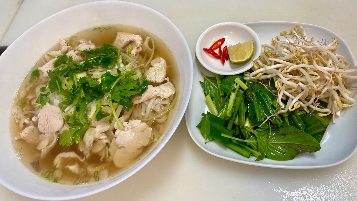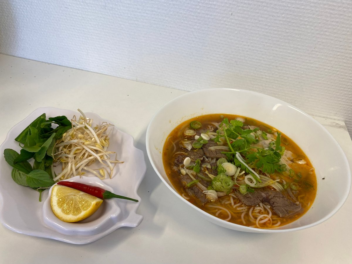 Sterk huê suppe m/ oksekjøtt, risnudler, svin, løk og urter.