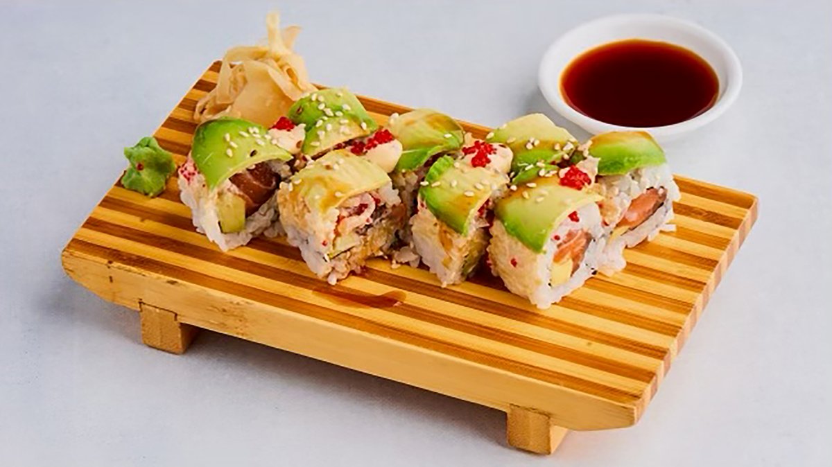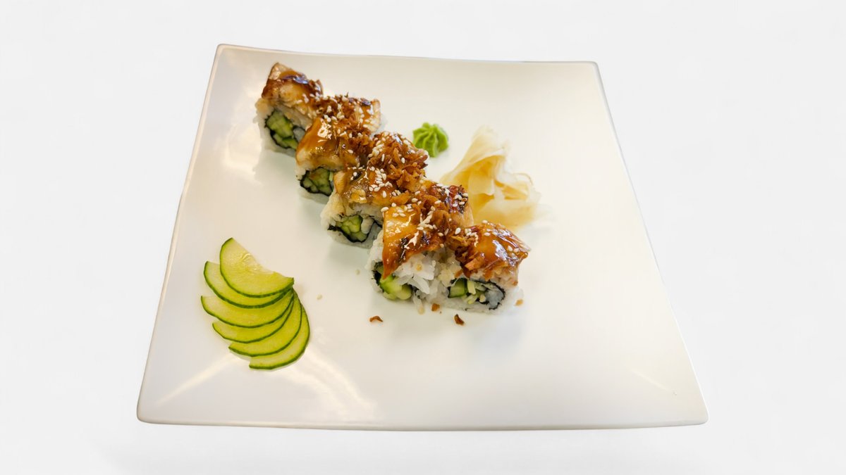 Agurk , avokado ,kokt scampi med flambert ål , teriyaki og sprøstekt løk på toppen.