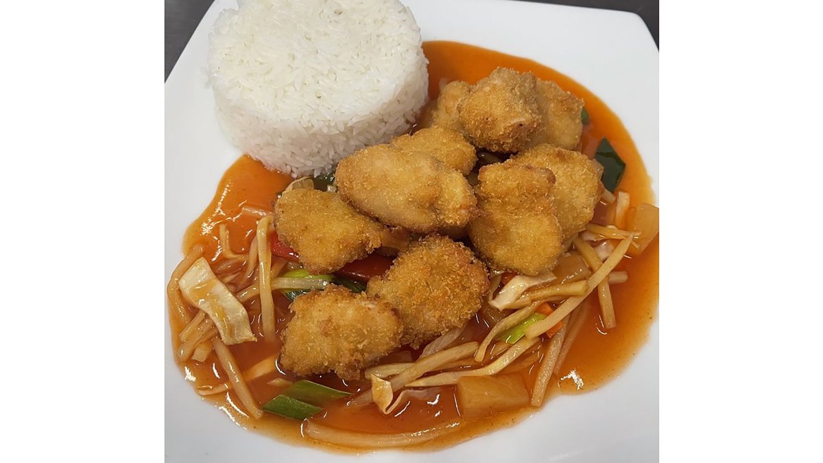 Fritert kylling i sursøt saus.