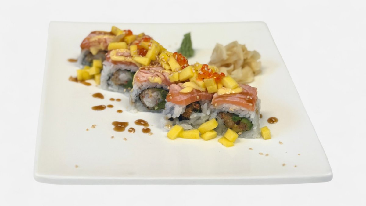 Fritert scampi , avocado , frambert laks og mango på toppen.