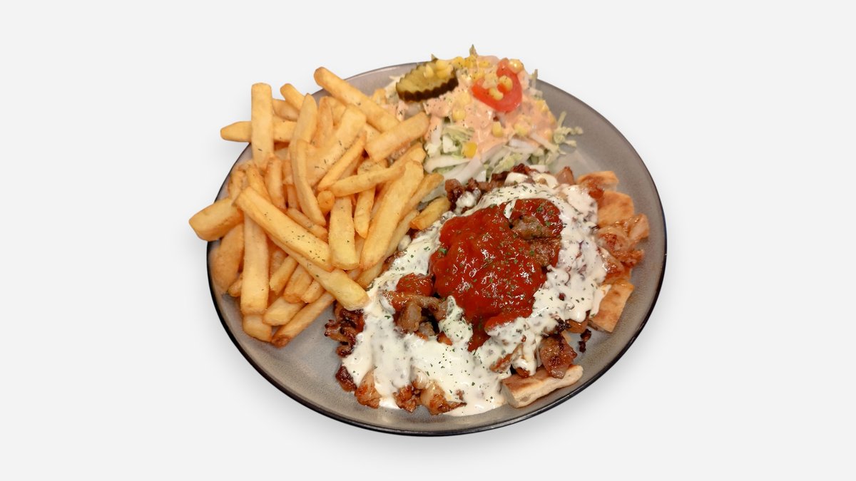 Kebabkjøtt, salat, dressing, pitabrød, hvitløksdressing og pommes frites.