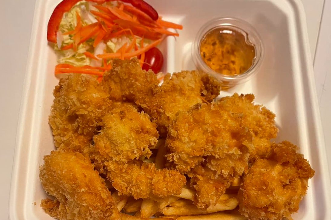 Tallerken med innbakt scampi, salat ,chili saus og plommesaus. Velg mellom ris eller pommes frites.