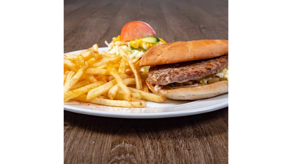 Serveres med salat, dressing og pommes frites.. Velg størrelse.