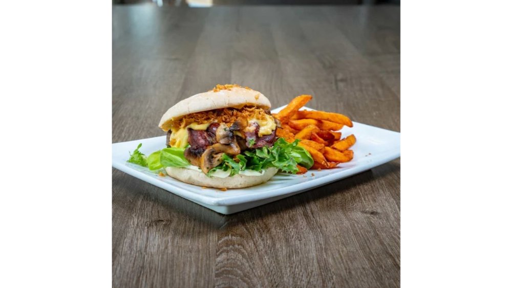 Serveres med stekt sopp, sprøstekt løk og bearnaise. Speltbrød, salat, hvitløksdressing og søtpotetfries