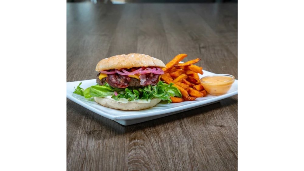 Serveres med syltet rødløk, chilimajones og hvitløksdressing. Speltbrød, salat og søtpotet fries