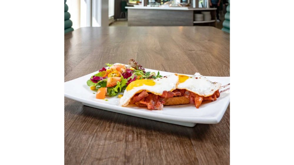 Syltet rødløk, honning, ristet nøtter. Velg mellom ett eller to egg.