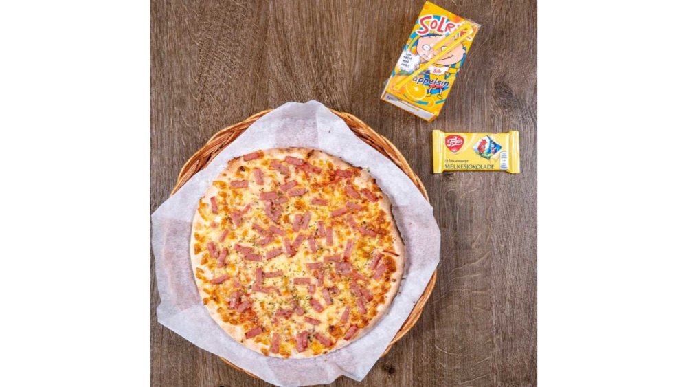 22cm pizza. Velg mellom skinke eller kjøttdeig. Vegetar dersom ønskelig. (Følger med en Amigo juice og en eventyrsjokolade)