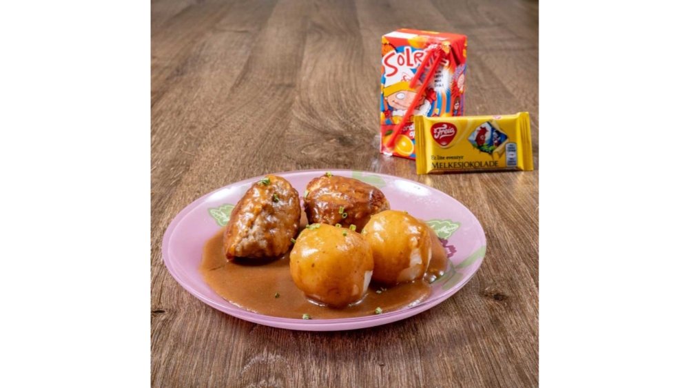 2 stk kjøttkaker, potet og brun saus. (Følger med en Amigo juice og en eventyrsjokolade)