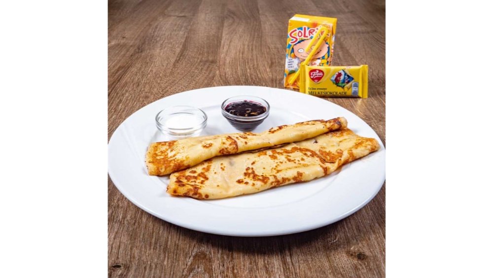 2 stk pannekaker med sukker og blåbærsyltetøy. (Følger med en Amigo juice og en eventyrsjokolade)
