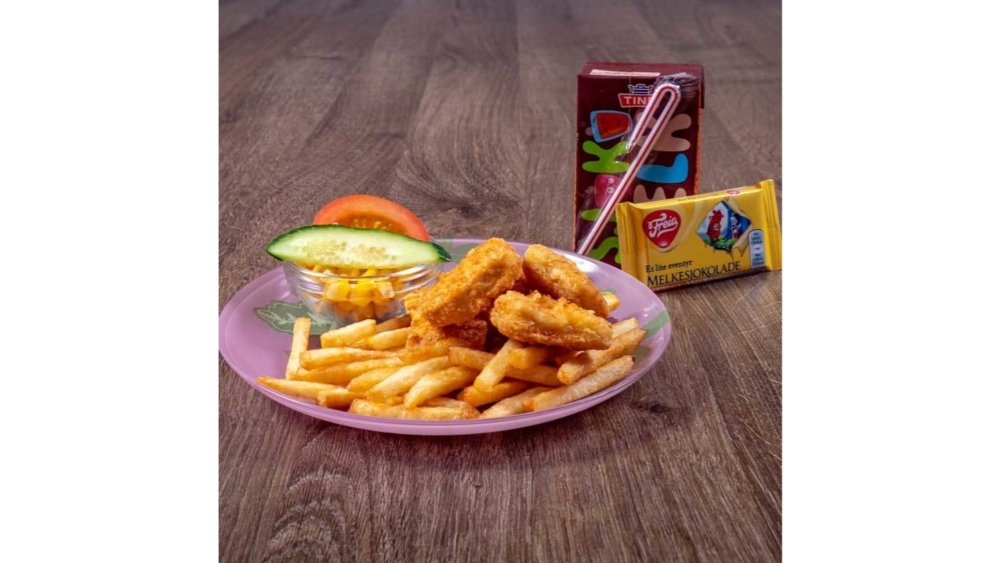 5 stykk nuggets, pommes frites, mais, tomat og agurk (Følger med en sjokolademelk og en eventyrsjokolade)