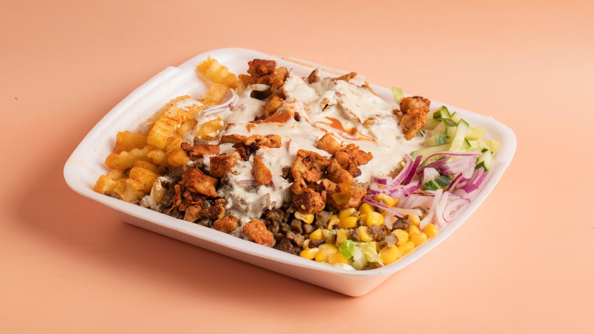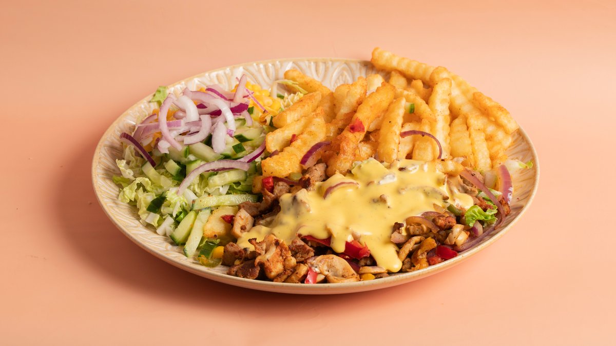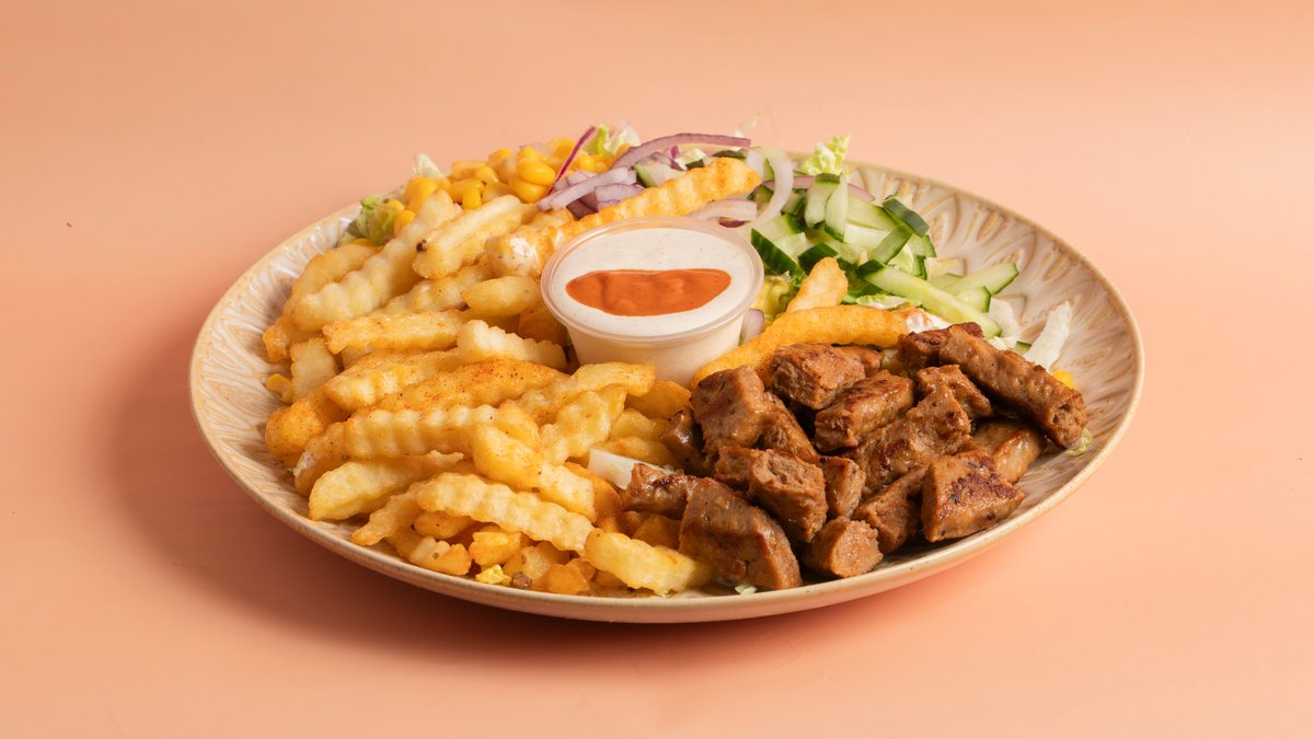 Kebabtallerken med pommes frites, salat og dressing.