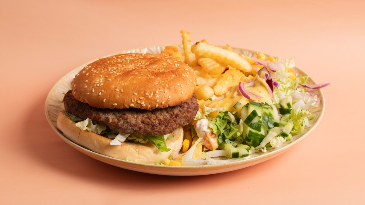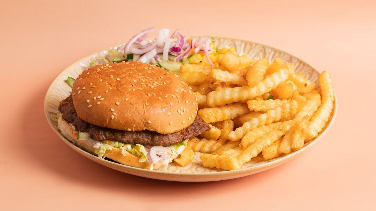 Hamburgertallerken med pommes frites. Velg størrelse.