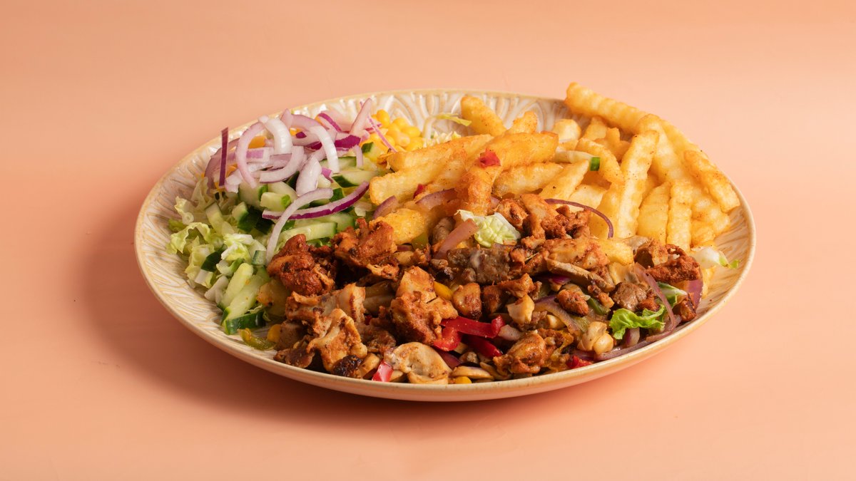 Mix grill med kylling, døner, kebab. Serveres med salat, pommes frites og dressing.