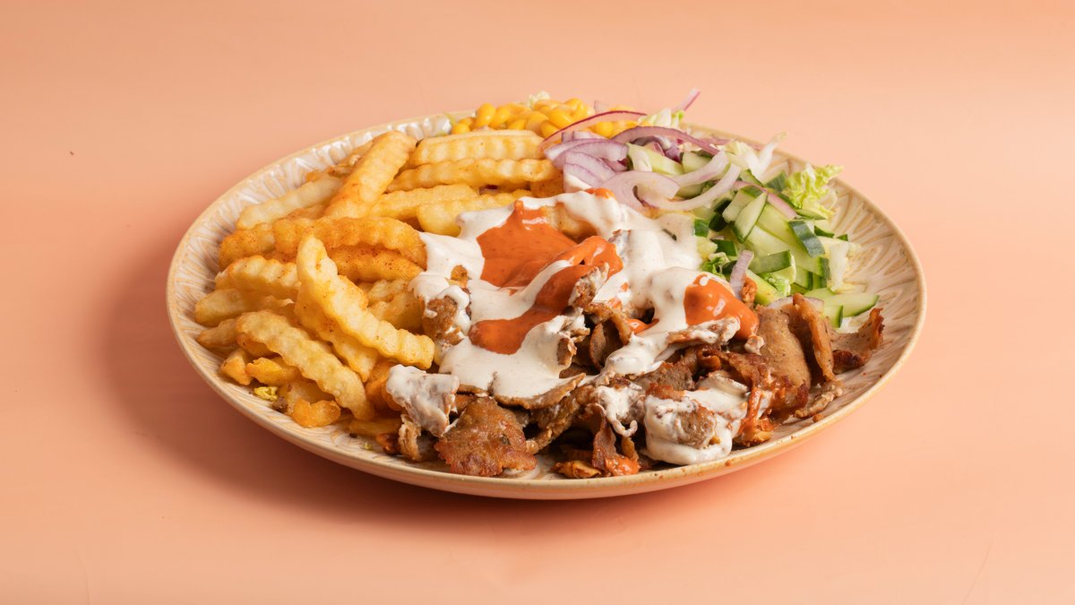 Döner tallerken med salat, pommes frites og dressing.
