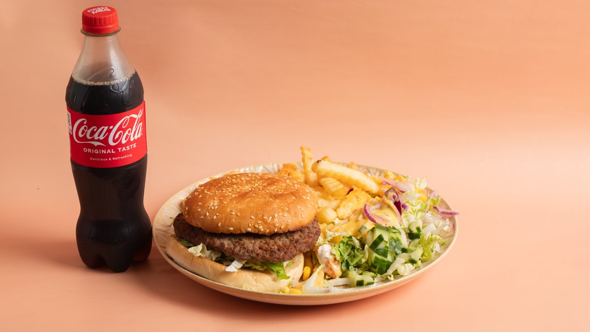 Hamburgertallerken med pommes frites og valgfri drikke. Velg størrelse.
