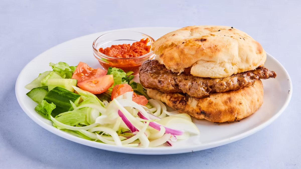 Hjemmelaget balkansk burger med lepinjebrød, salat, løk og ajvar