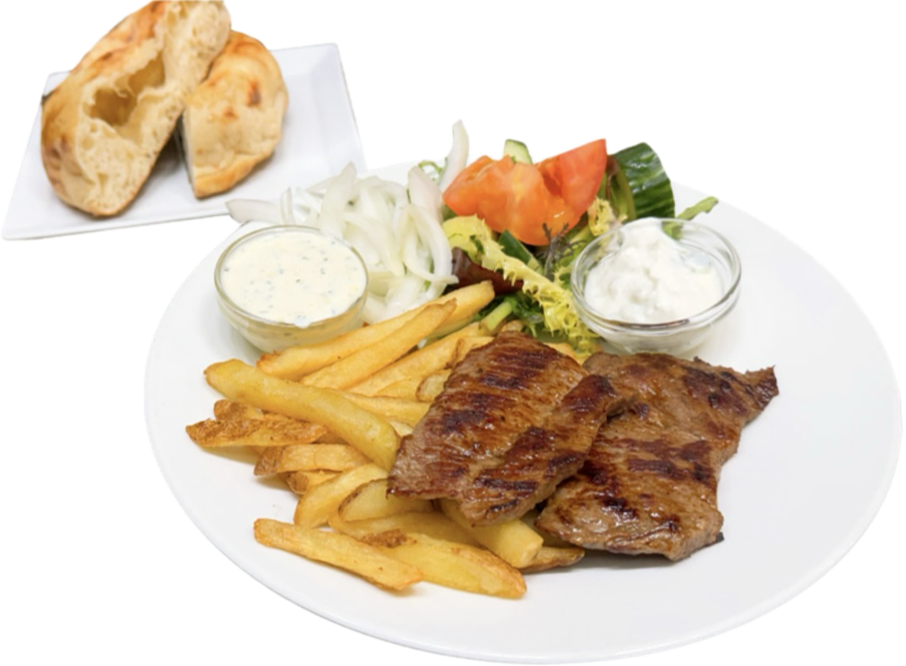 Marinert oksefilet grillet på 3 spyd med lepinjebrød, salat, friterte poteter og tzatziki.