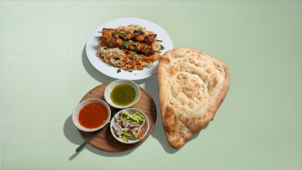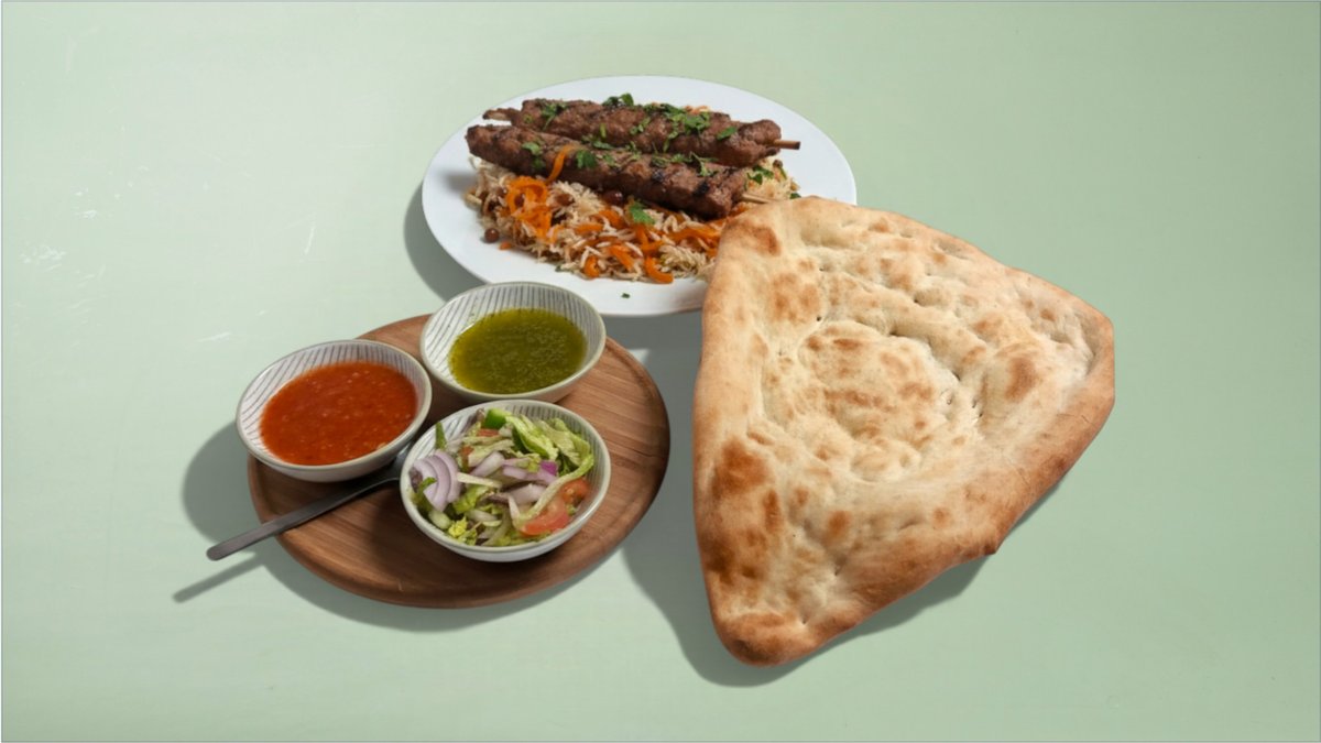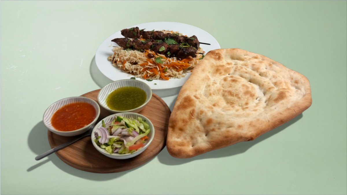 Mahicha Qabuli Palow og Mix Grill serveres med naan, salat og firni.