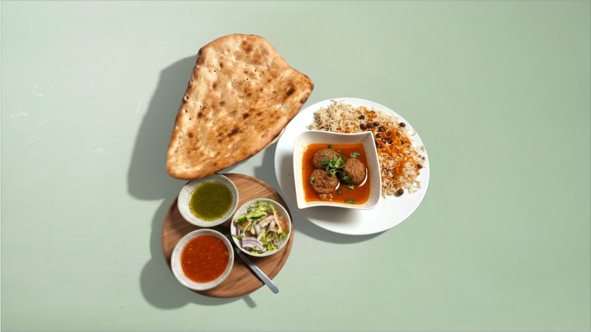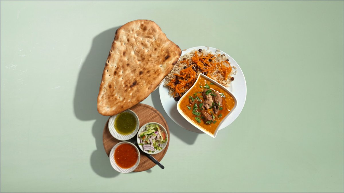 Lam Charsi Karahi serveres med naan og salat.