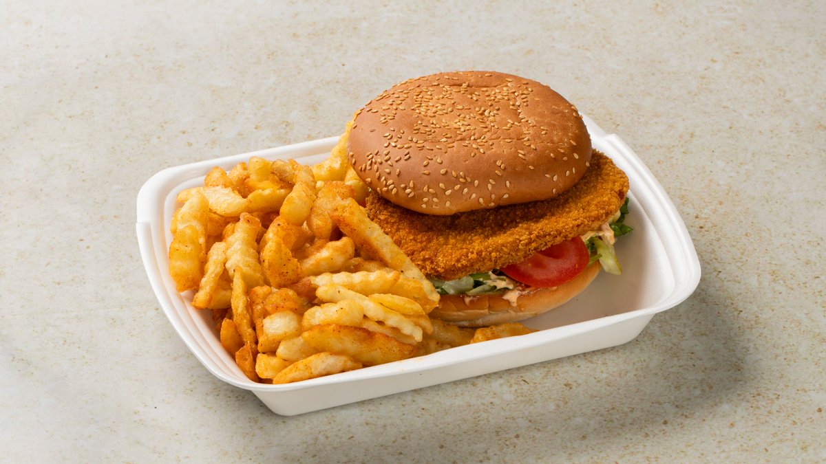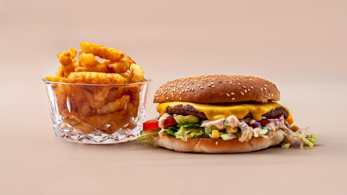Falafeltallerken med salat og pommes frites. 8 stk. falafel.