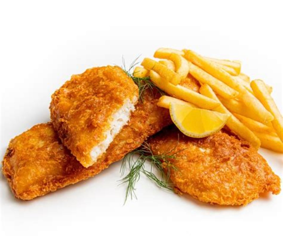 Fritert fisk og pommes frites, serveres med salat, mais, agurk, løk, tomater, remulade dressing og sitronskive. Dobbel porsjon inneholder 2 x 125 g med fisk.