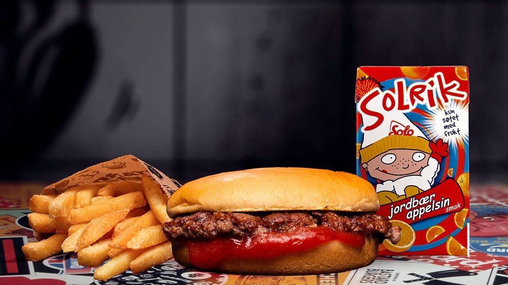2x 60g burgers med gul løk og fire (!!!) skiver ost. Fries og en brus er inkludert i alle meals.