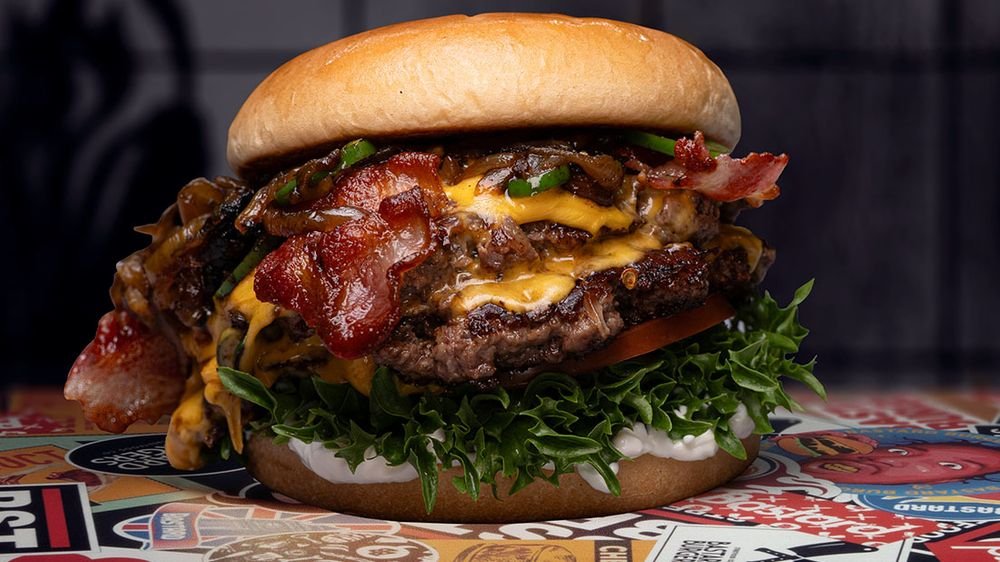 2x 120g storfekjøtt, karamellisert løk, jalapeños, bacon, fire skiver ost, tomat, salat og sweet & hot jalapeñodressing.