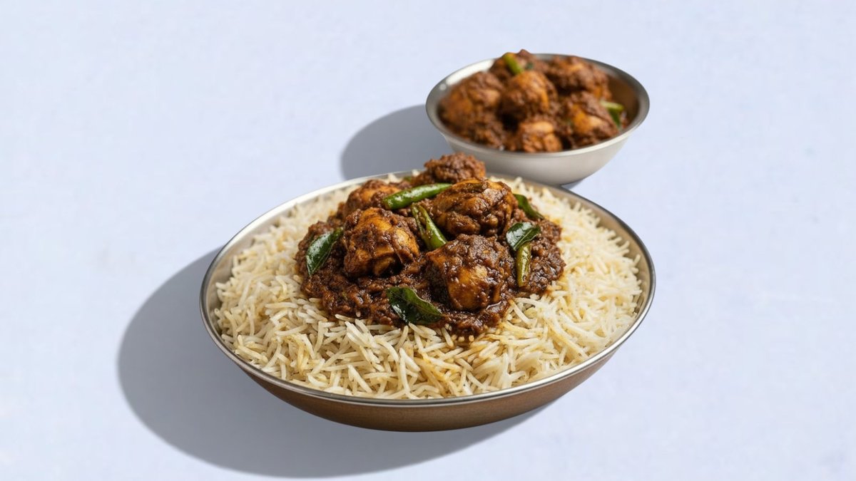 Aromatisk vanlig biryani ris servert med krydret og mør Mutton Sukka, en perfekt kombinasjon av dype smaker og autentisk sørindisk preg. Serveres med auberginesaus og raita Aromatic plain biryani rice paired with richly spiced mutton sukka, combining deep flavors and soft meat for a perfect South Indian taste. Served with brinjal gravy and raita.
