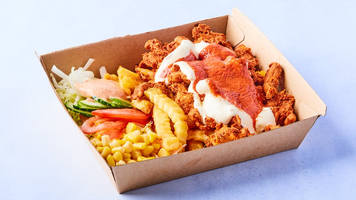 Falafel med BKH Vegansk Saus, pommes frites, grønnsaker, salat, mais, agurk, løk, tomat, champignon, ananas og dressing. Det serveres med pitabrød ved siden av.