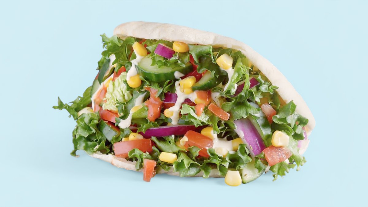 Grønnsaker i pita med BKH Vegansk Saus, salat, mais, agurk, løk, tomat og dressing. Velg mellom liten og stor.