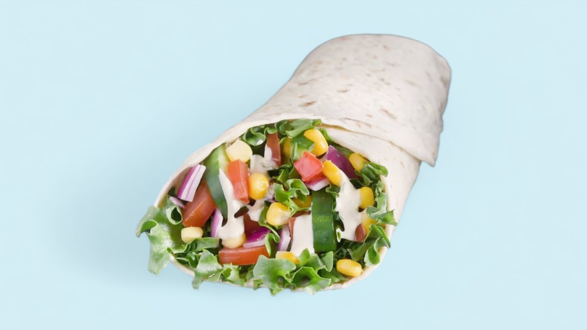 Grønnsaker i rull med BKH Vegansk Saus, salat, mais, agurk, løk, tomat og dressing. Velg mellom liten og stor.