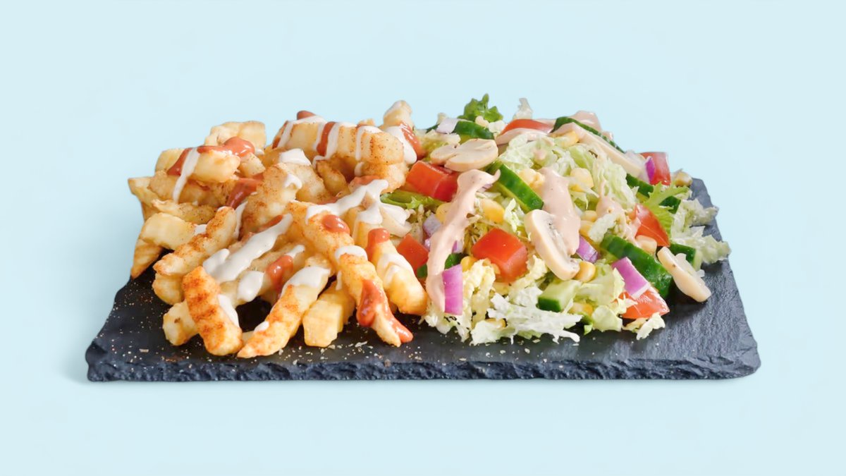 Grønnsaker med BKH Vegansk Saus, pommes frites, salat, mais, agurk, løk, tomat, champignon, ananas og dressing. Det serveres med pitabrød ved siden av.