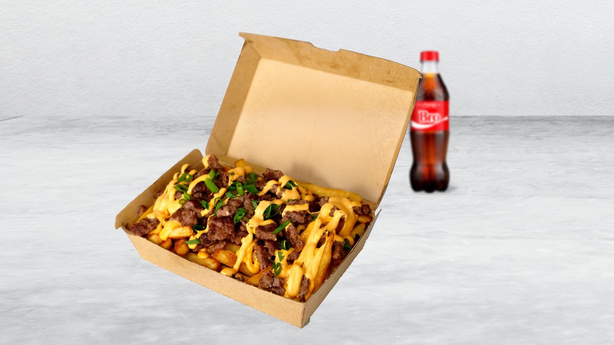En porsjon bistrofries med grillsmak, toppet med biter av smashburger, sriracha-majones og friskhakket gressløk.