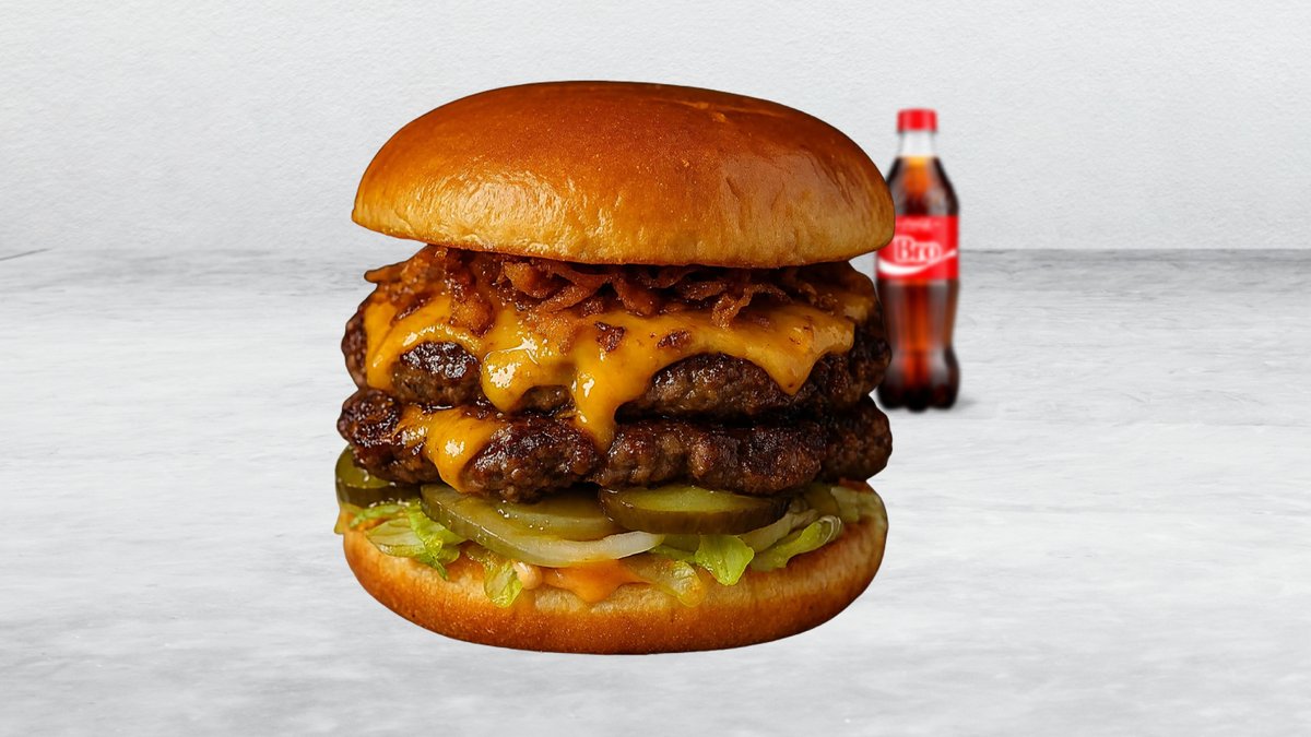 Hjemmelaget brød med dobbel ost smashburgere, hvit og rosa dressing, friske grønnsaker og valgfri saus – mild, medium eller sterk.