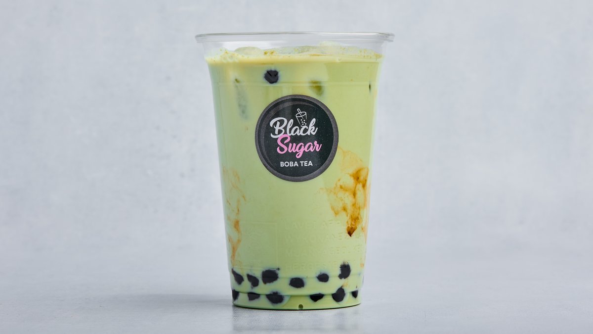 Svart milk tea med matcha, brunt sukker og tapioka perler.