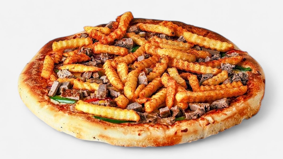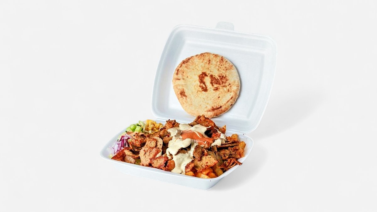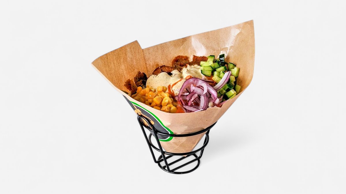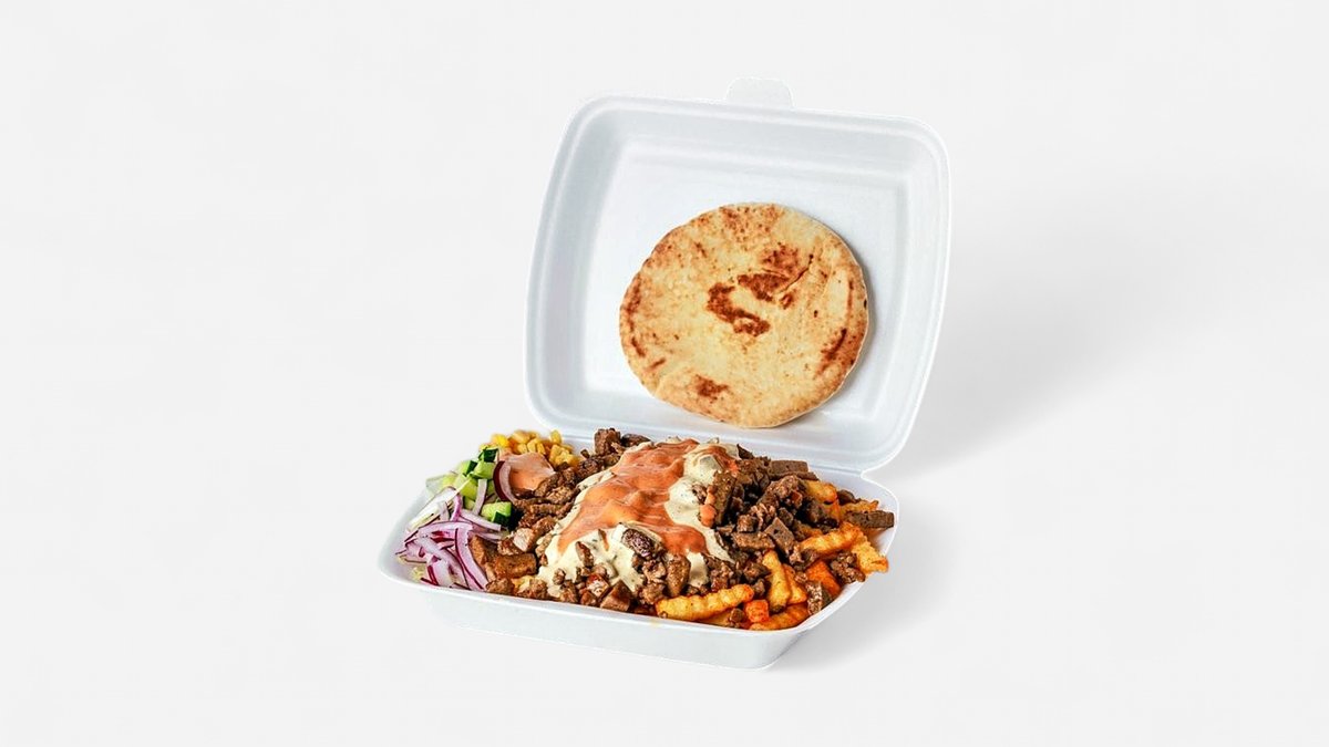 Kebabkjøtt, mais, løk, paprika, Kebab saus og pommes frites på toppen