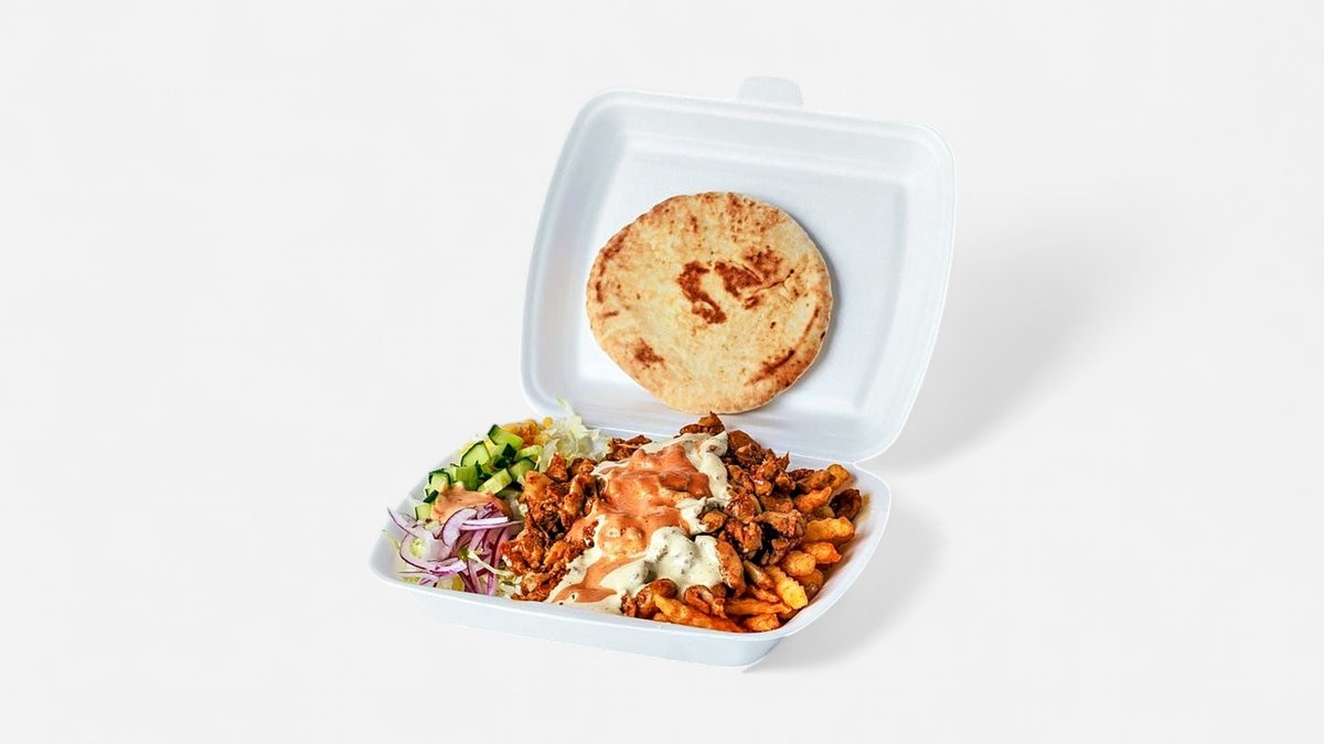 Kylling kebab med grønnsaker, dressing, pommes frites og pitabrød **Vi lager pommes frites for hver bestilling, men pga leveringstid kan pommes frites bli soggy**