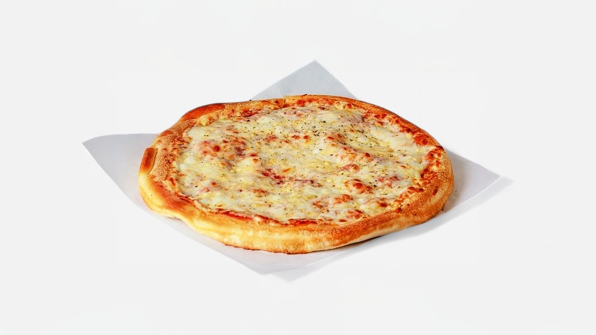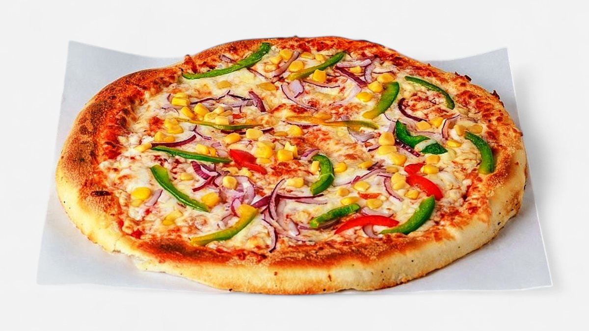 Vegetar pizza med tomatsaus, paprika, champignon, løk, mais, oliven og ost.