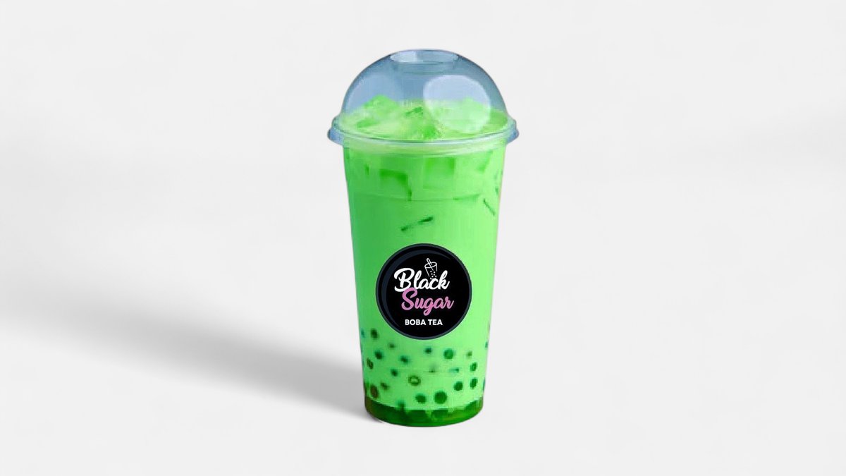 Grønn te med fersk melk og Honeydew smak. Inkludert 2 gratis valg av topping.
