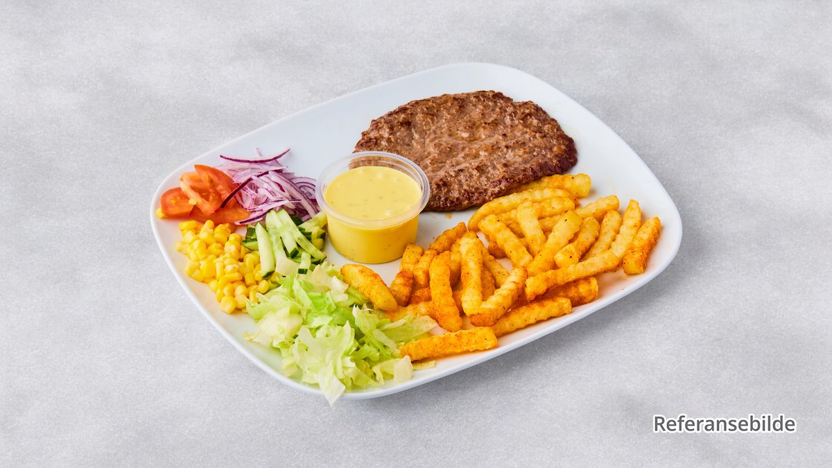Biffburger av storfé med salat, mais, agurk, tomat, løk og hamburgerdressing. Hvis du velger "Tallerken", innkluderer det pommes frites.