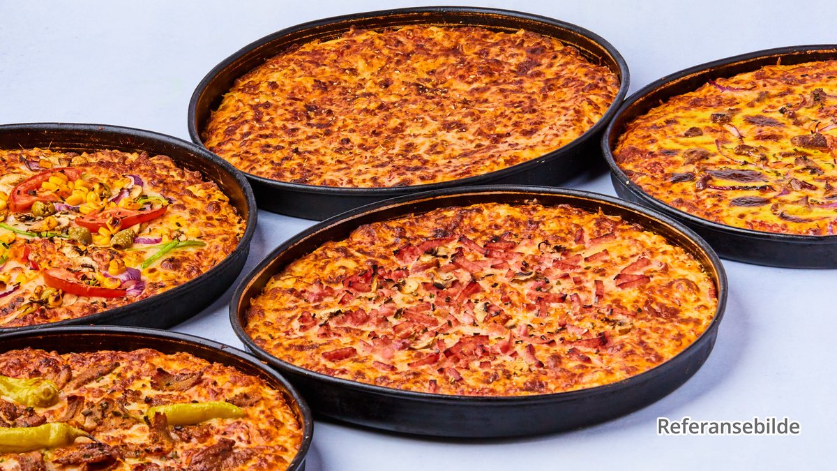 Pizza med pepperoni, biff, champignon og løk.