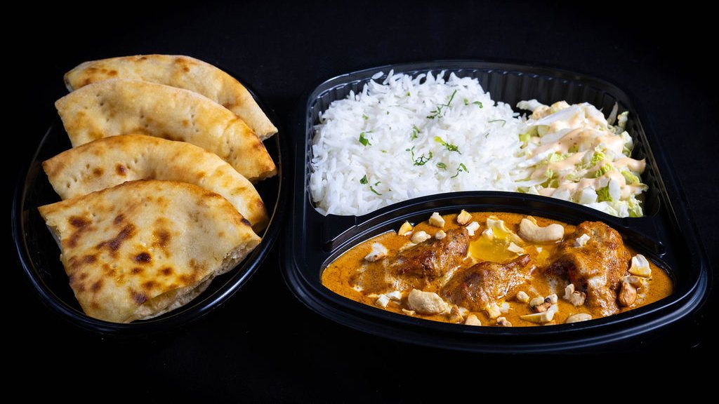 Grillet kylling i fyldig kremet saus, servert med ris. Naan må bestilles i tillegg.