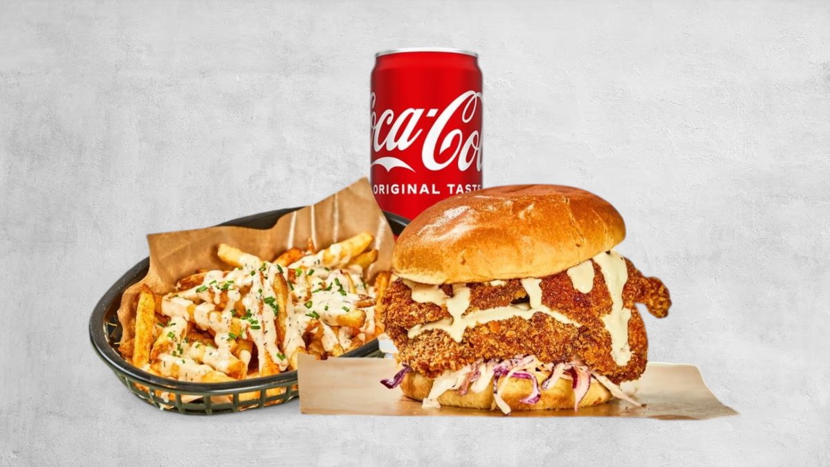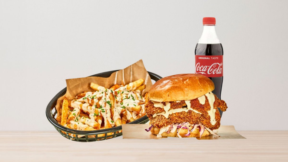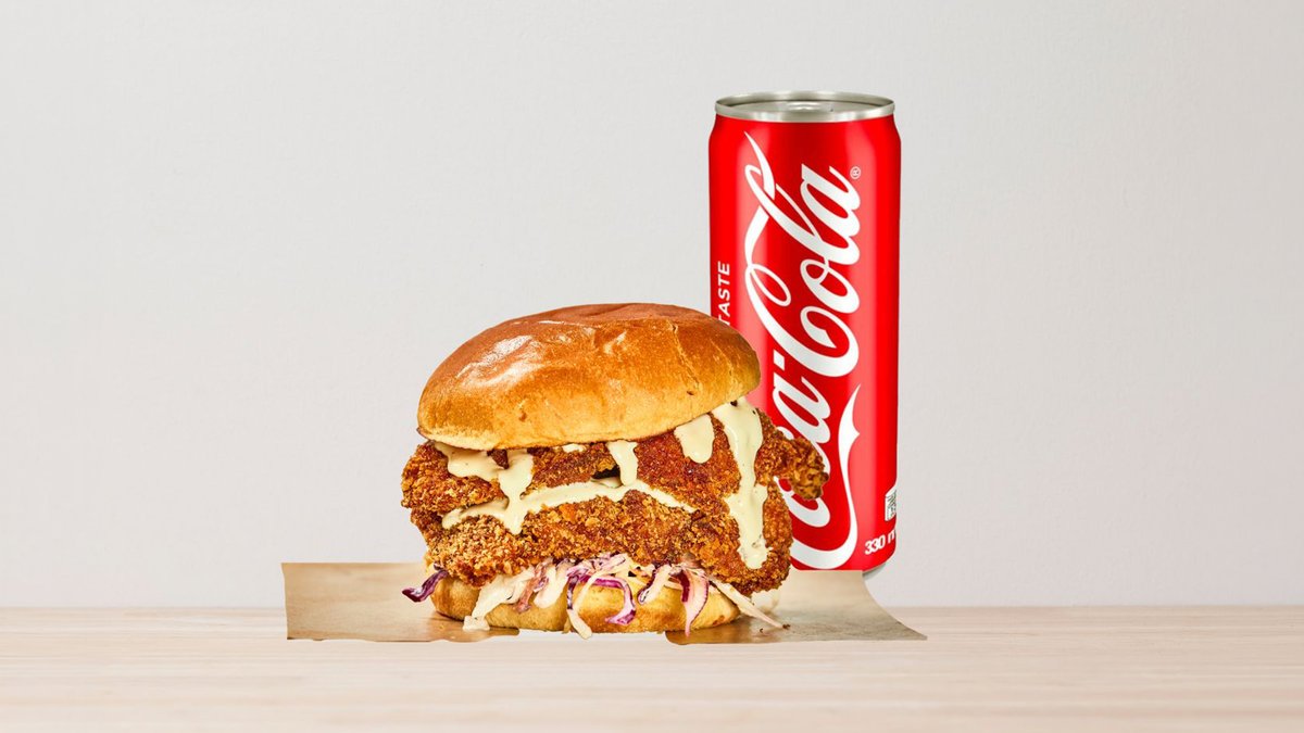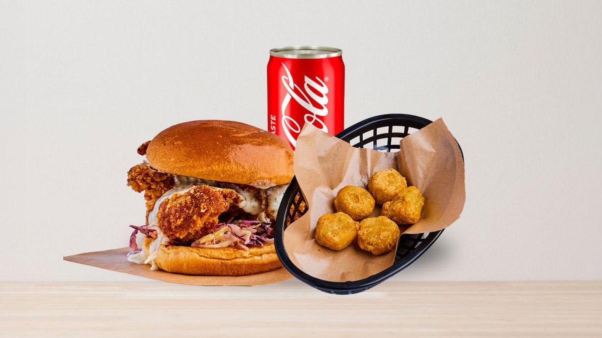 Frityrstekt benfritt kyllinglår, coleslaw, brioche brød med hjemmelaget saus + 1 chili cheese + 1 soda