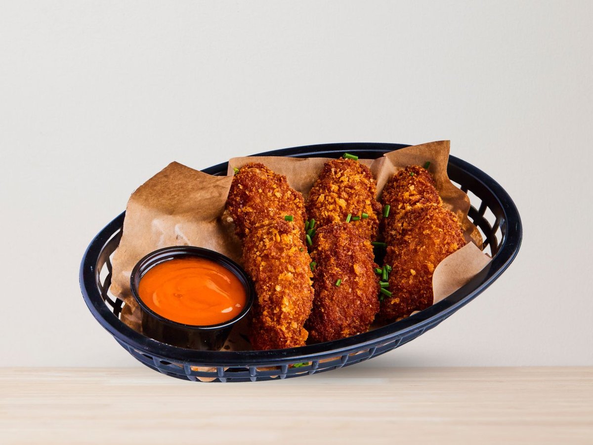 Frityrstekt, 5 benfri kyllingfilet tenders med hjemmelaget Buffalo Hot saus. Toppet med ett hint gressløk.