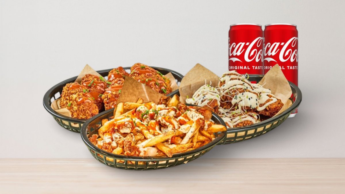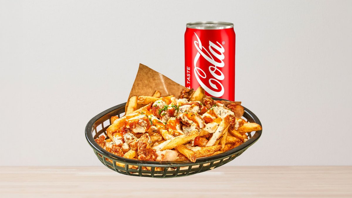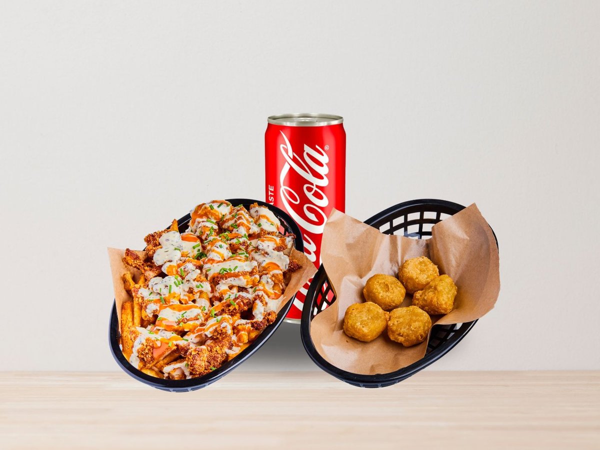 Frityrstekt benfritt kyllinglår, pommes med hjemmelaget saus(Garlic parmesan & Buffalo Hot) +1 chili cheese +1 soda **Vi lager pommes frites for hver bestilling, men pgv leveringstid kan pommes frites bli soggy**