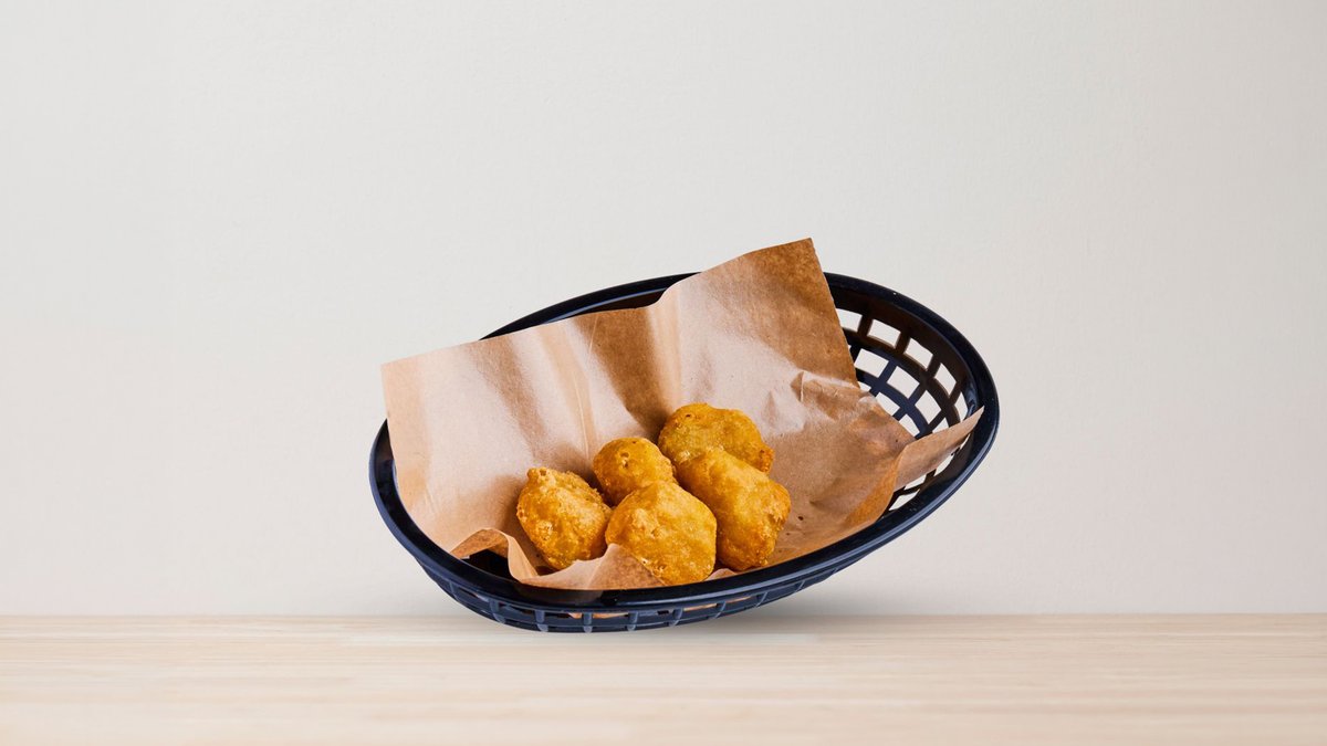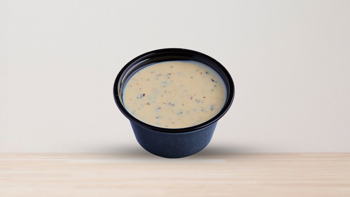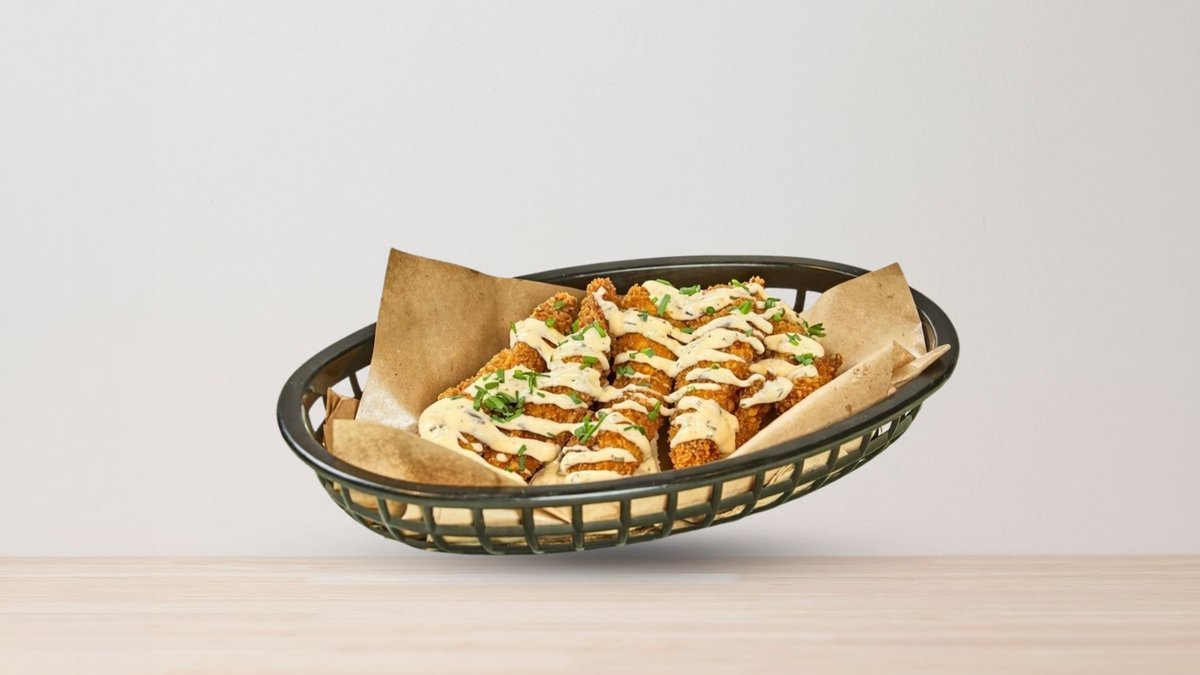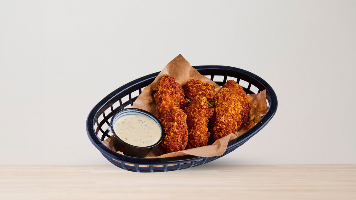 Frityrstekt, 5 benfri kyllingfilet tenders med hjemmelaget saus vår besteselgende garlic parmesan saus. Toppet med ett hint gressløk..