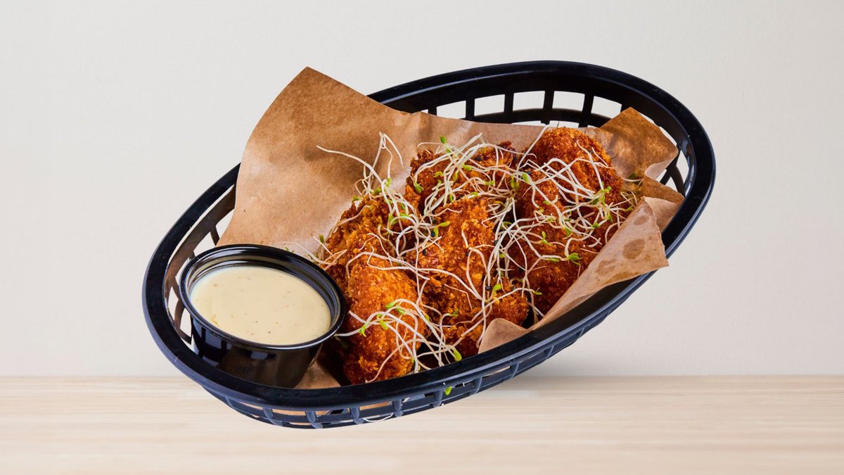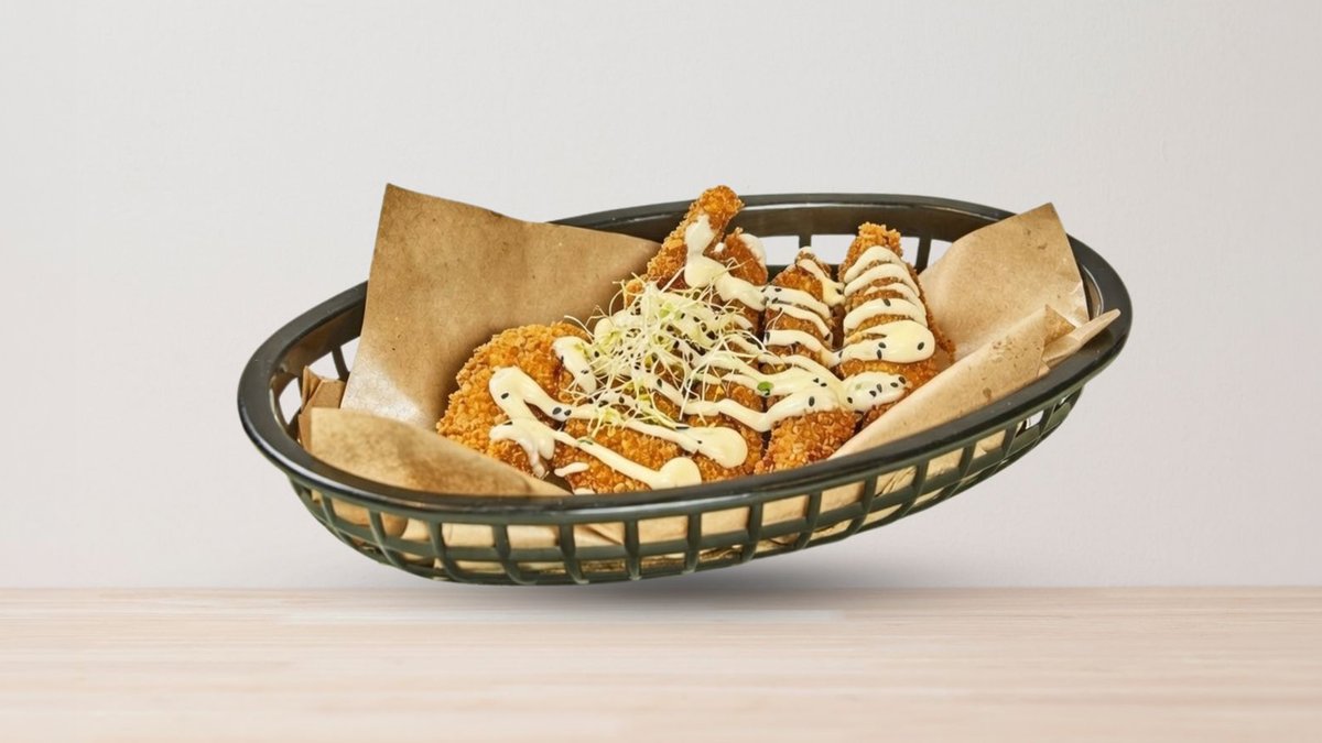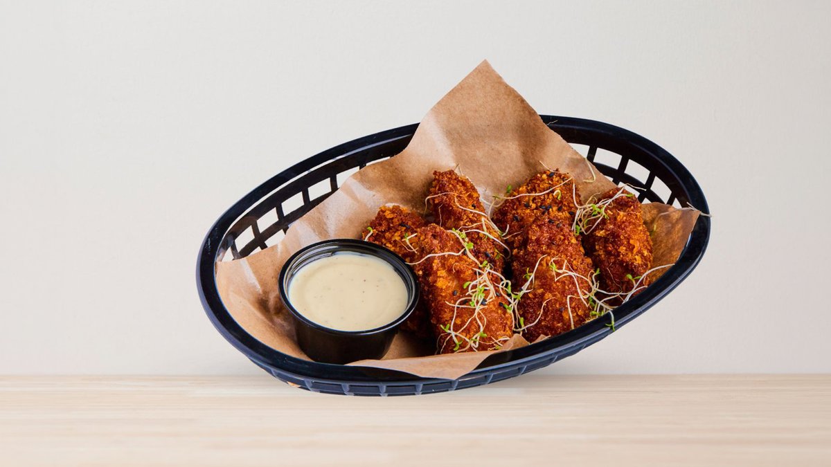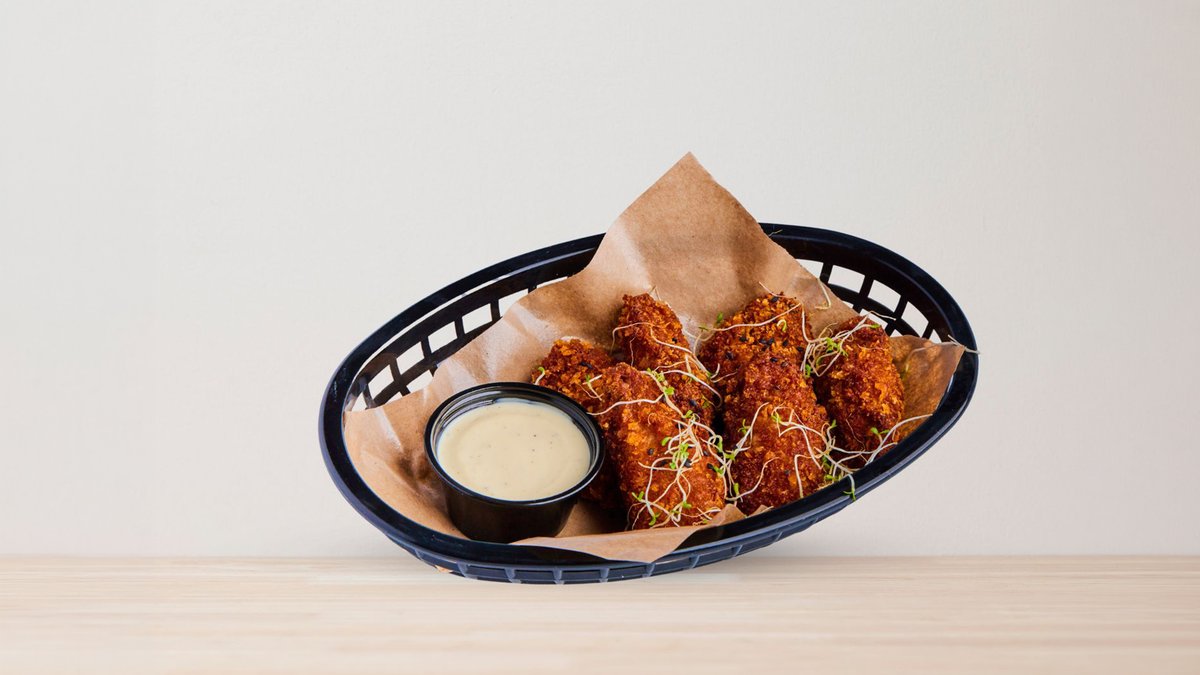 Frityrstekt, 5 benfri kyllingfilet tenders med hjemmelaget saus Truffle Mayo. Toppes med alfalfa spirer og svarte sesamfrø.