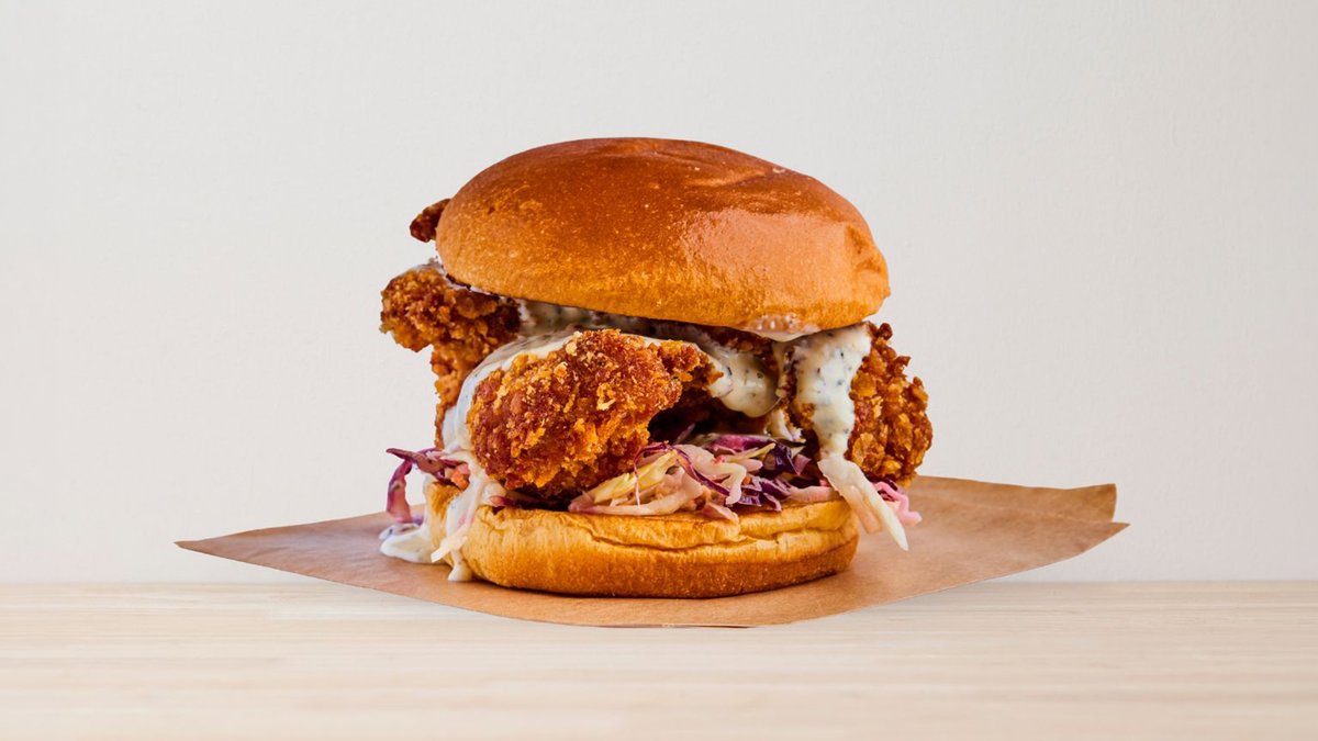 Frityrstekt benfritt kyllinglår, servert med coleslaw i brioche brød og valgfri saus