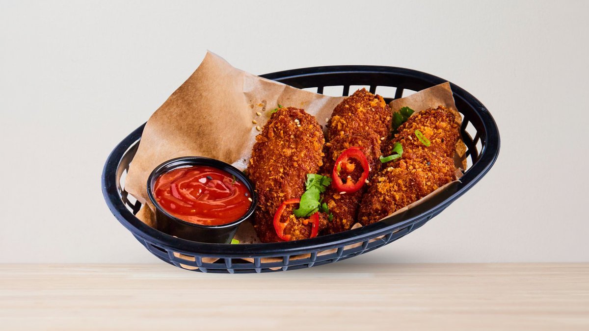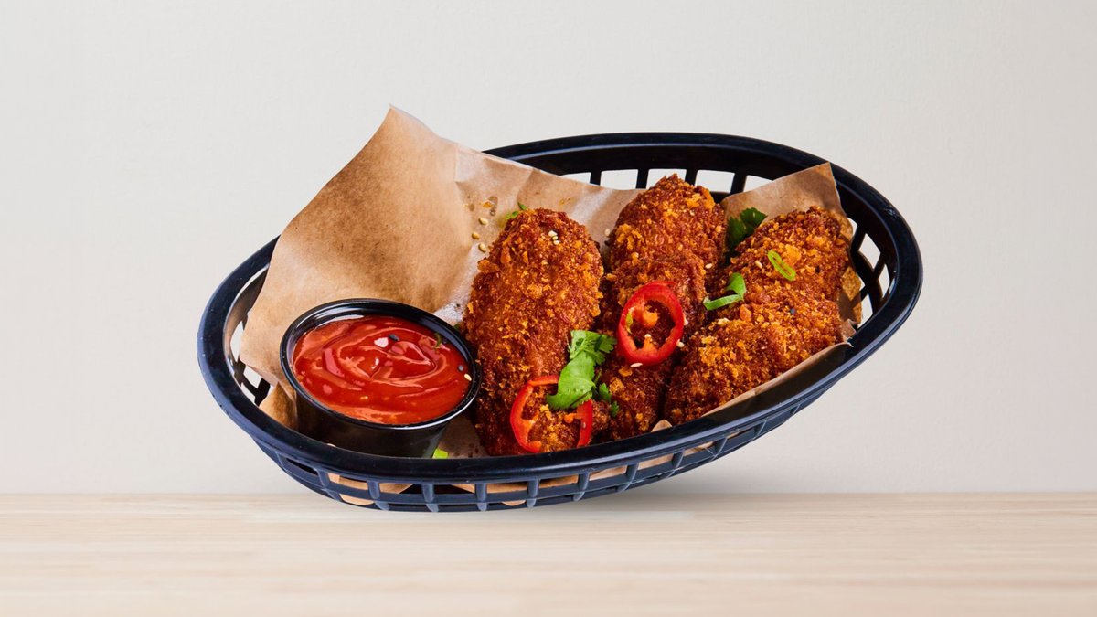 Frityrstekt, 5 benfri kyllingfilet tenders med hjemmelaget saus Korean Spicy. Toppet med koriander, chilipepper, vårløk og sesamfrø.