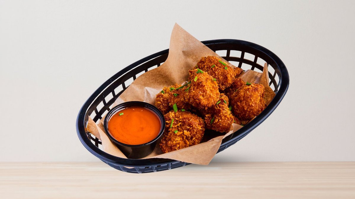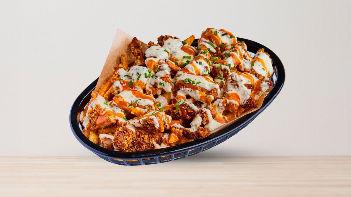 Frityrstekt benfritt kyllinglår, pomme, hjemmelaget hvitløksparmesan og buffalo hot. Toppet med gressløk. **Vi lager pommes frites for hver bestilling, men pgv leveringstid kan pommes frites bli soggy**